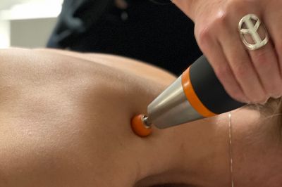 En djupgående behandling där jag alternerar händer med en maskin som med tryckvågor kommer ner på djupet och mjukar upp spänd bindväv och släpper på spänningar i fascian.